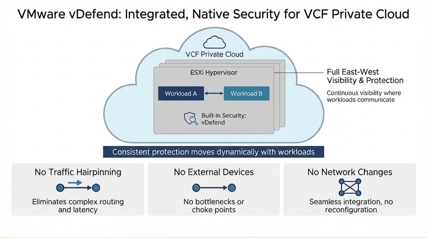 vDefend delivers integrated security by operating natively within the VCF private cloud. Every hypervisor acts as a built-in sensor, providing continuous visibility and protection where application workloads actually communicate. This architecture provides security teams with essential capabilities that external tools lack, including 360-degree visibility into both east-west and north-south traffic and consistent protection that moves dynamically with application workloads.