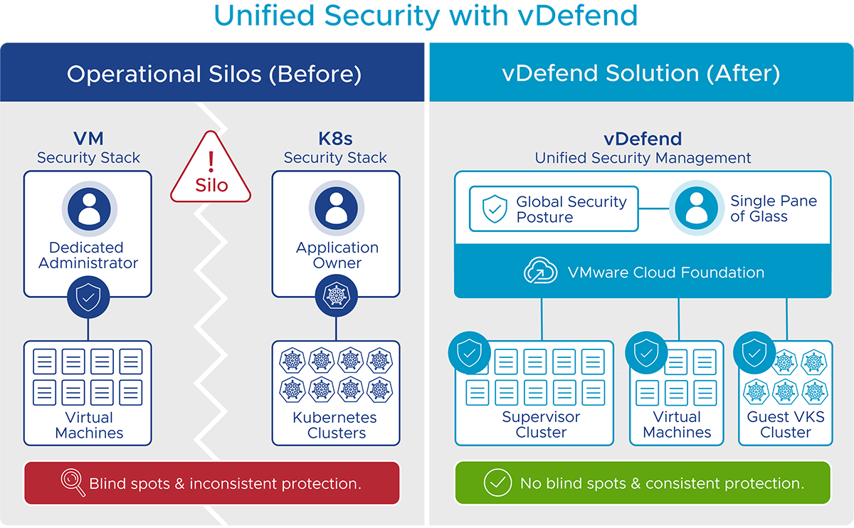Operational silos, where separate security stacks have to be implemented for virtual machines and Kubernetes clusters, are a major hurdle in modern infrastructure, often leading to inconsistent protection and blind spots. vDefend addresses this by providing a unified security management solution for VMs and Kubernetes (VKS) workloads through a single pane of glass within VCF. This enables security administrators to define a global security posture that is consistently applied across the entire Supervisor cluster and all guest VKS clusters, without treating the VKS clusters as opaque entities.
