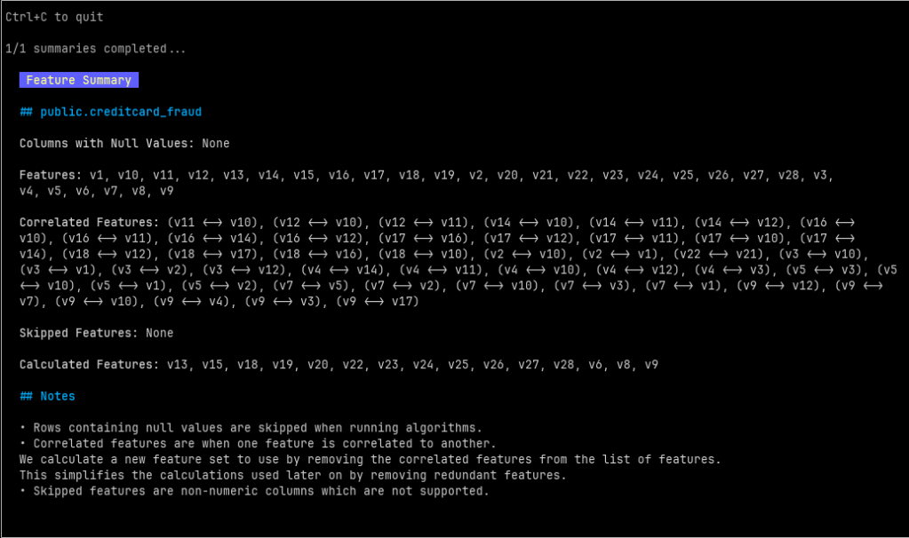 To train a model to detect fraudulent transactions, select the database and table containing the training dataset. Next, select the id column, the “is_fraud” column to predict on, and the feature columns V1, V2,…V28. gpMLBot will automatically identify and remove correlated features to simplify and speed up the algorithms. The below screenshot shows how we went from an input of V1…V28 features to just 15, eliminating the correlated columns.