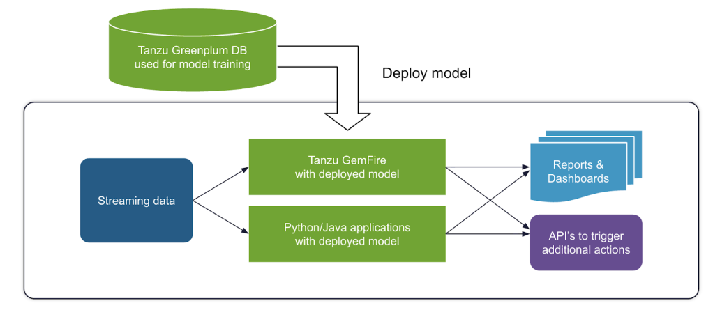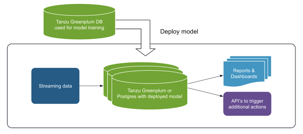 Deploy exports a trained model for use in production environments. Exporting as SQL allows the deployed model to be imported into a production Greenplum or PostgreSQL server consuming realtime streaming credit card transaction data.