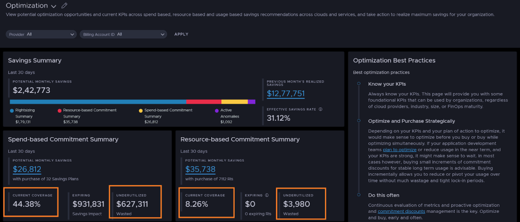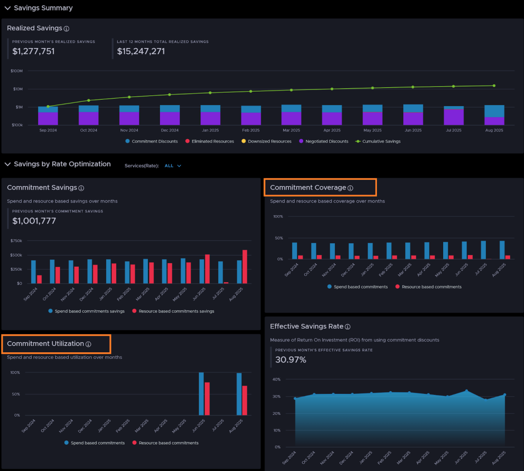 The “Current Coverage” and “Underutilized” metrics in the Optimization Dashboard, as well as the “Commitment Coverage” and “Commitment Utilization” metrics in the Realized Savings Dashboard, have been enhanced to support both spend-based and resource-based commitments across all eligible services.