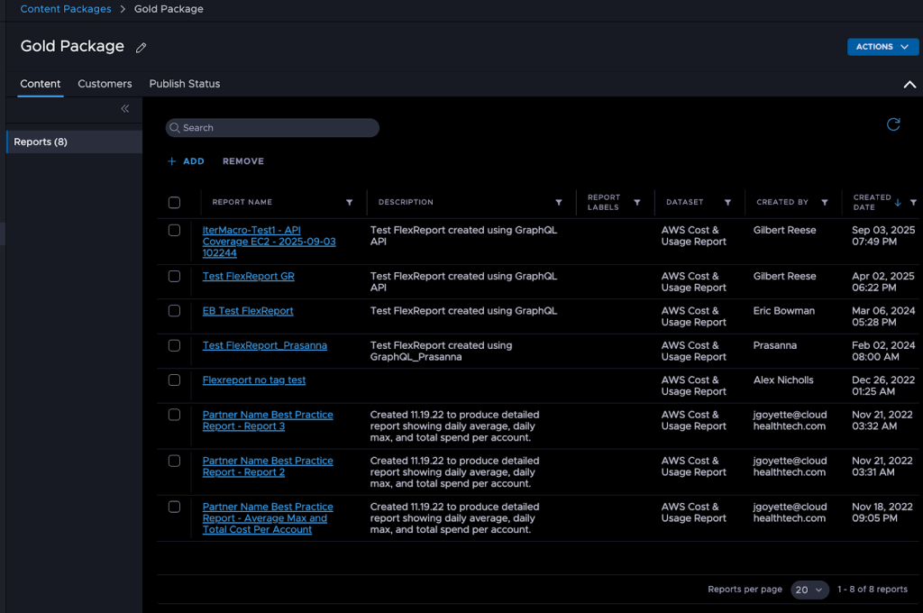 CloudHealth is excited to announce that the first phase of Content Packages is now generally available. Content Packages enable partners to easily scale a consistent service across their channel customers. This first phase allows you to manage and share FlexReports created in the partner tenant with specific channel customers. Updates to these reports can then be “Published” so that changes made in the partner tenant are reflected in all assigned channel tenants.