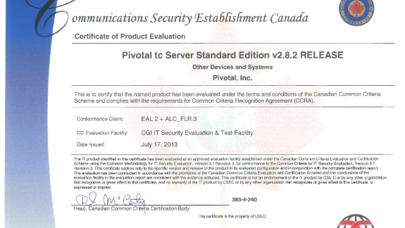 On July 17, 2013, Pivotal’s tc Server reached an important milestone—the certification body of the Canadian Common Criteria Evaluation and Certification Scheme (CCS) completed the certification of Pivotal tc Server Standard Edition v2.8.2 RELEASE to the EAL 2+ level of assurance. The successful completion of this certification process, which requires nearly a year of investment, demonstrates Pivotal’s commitment to providing their customers with a high-level of security certified by a third-party.