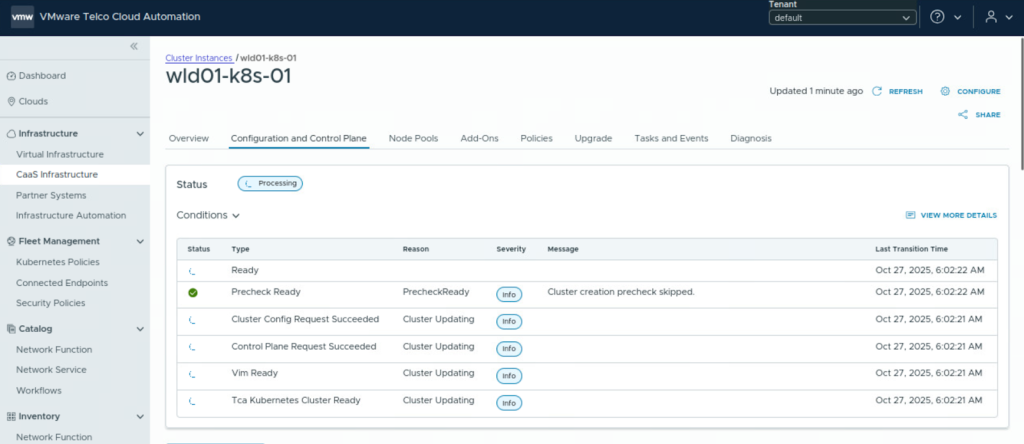 - Navigate to Infrastructure -> CaaS Infrastructure and click on the CaaS workload cluster (in this case, wld01-k8s-01). Then click on the Configuration and Control Plane tab and confirm that the cluster update task has been triggered and the status is Processing. The certificate renewal process for CaaS clusters includes creation of new control plane nodes in that CaaS cluster embedded with the new certificates.