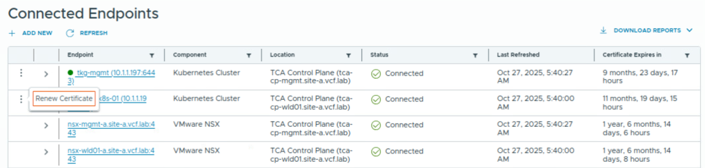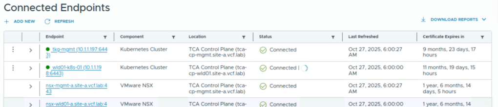 Broadcom addresses these challenges by providing endpoint connectivity, certificate observability and management functionalities within VMware Telco Cloud Platform. This enables CSPs to monitor connectivity with the integrated components and their certificates in real-time, ensuring their validity, proper deployment, and continued secure communication between systems. This level of visibility is essential for uninterrupted services, protection against breaches, and regulatory compliance. Furthermore, automated certificate renewals eliminate the risk of unnoticed expirations, maintaining a seamless security posture across the infrastructure.