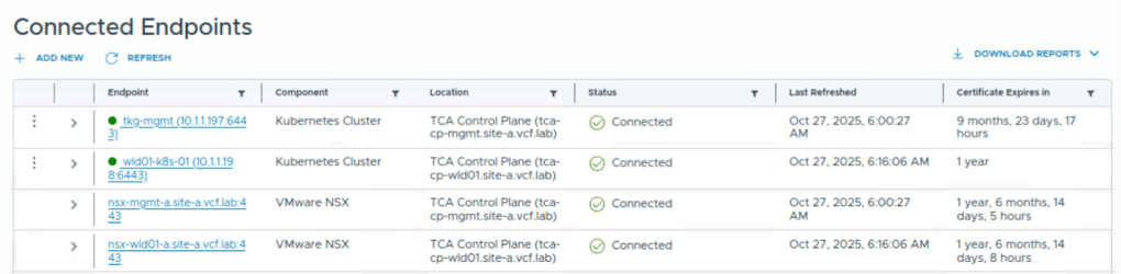 Telco Cloud Platform offers a centralized dashboard to actively monitor the status of certificates and the connection for all integrated components. It also verifies authenticated connectivity to these components, addressing situations where components are reachable but their service account passwords have expired or changed. Once Telco Cloud Automation and its control plane are integrated with the following endpoints, their connectivity, and certificates are automatically monitored: