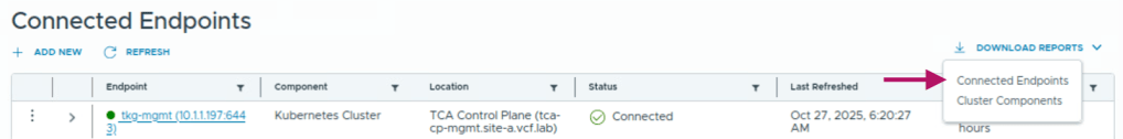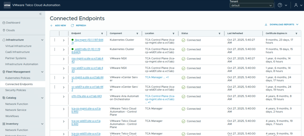 - In the Telco Cloud Automation UI, navigate to Fleet Management -> Connected Endpoints page.