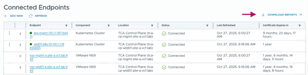 - Navigate to Fleet Management -> Connected Endpoints page and click on Download Reports.