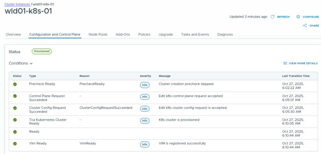 - Once the process completes, you will see the Status changed to Provisioned in the configuration and control plane tab of the CaaS workload cluster.