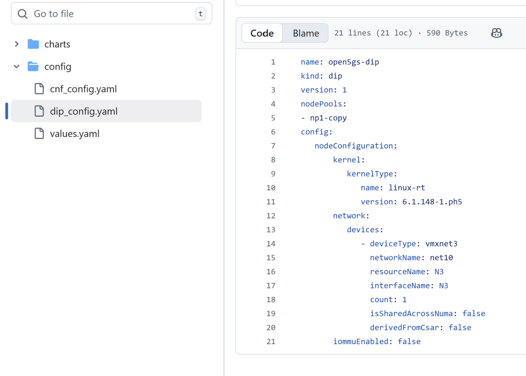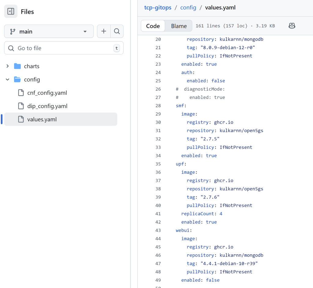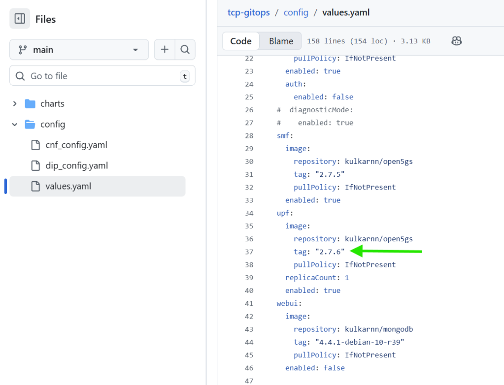 - Update Image Version in the values file: Log into the Git repository, navigate to the config folder and edit the file values.yaml and modify it to specify the updated container image version for the Open5GS UPF pod, and push this change to the Git repository.