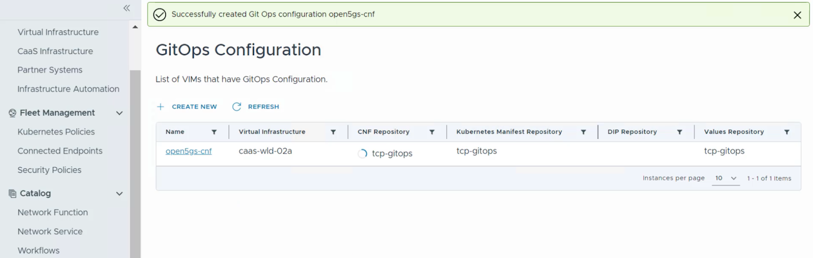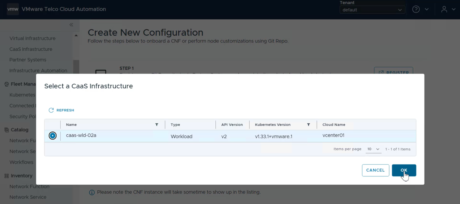 - Now let’s test the policy enforcement by deploying a CNF that violates the assigned security policies. Navigate to the Configuration sub-section in the GitOps section and click Create New. Click Select next to Select Workload Cluster, select the workload cluster (e.g., caas-wld-02a), and click OK.