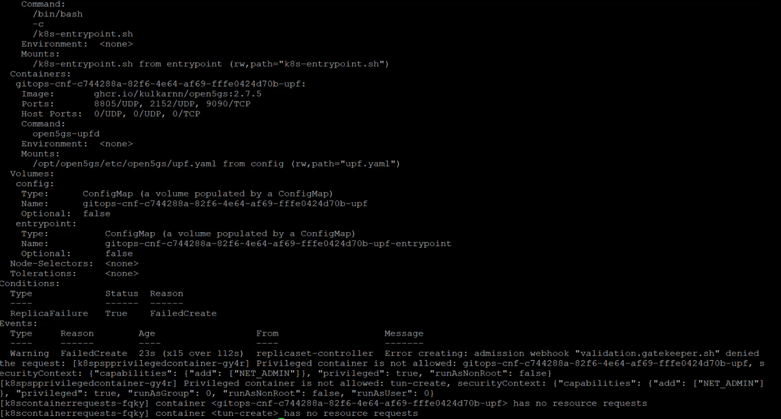 - You can log into the CaaS cluster via CLI and run kubectl describe replicaset command to get the deployment progress. As expected, the pod spin-up request is denied by Kubernetes Policy Manager. The admission denial occurs because the containers violated both enforced policies: they requested privileged access and failed to define resource requests.