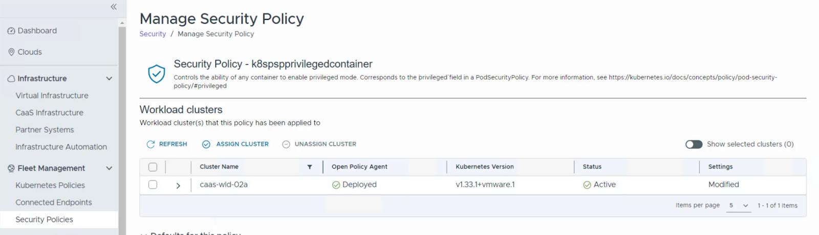 - Click on Assign Cluster, select the workload cluster (e.g., caas-wld-02a), and click Assign Policy to Clusters.