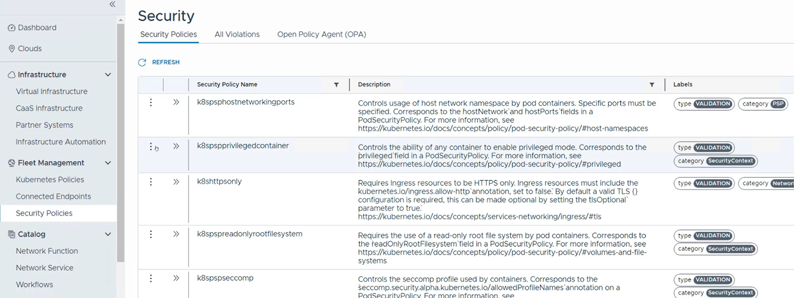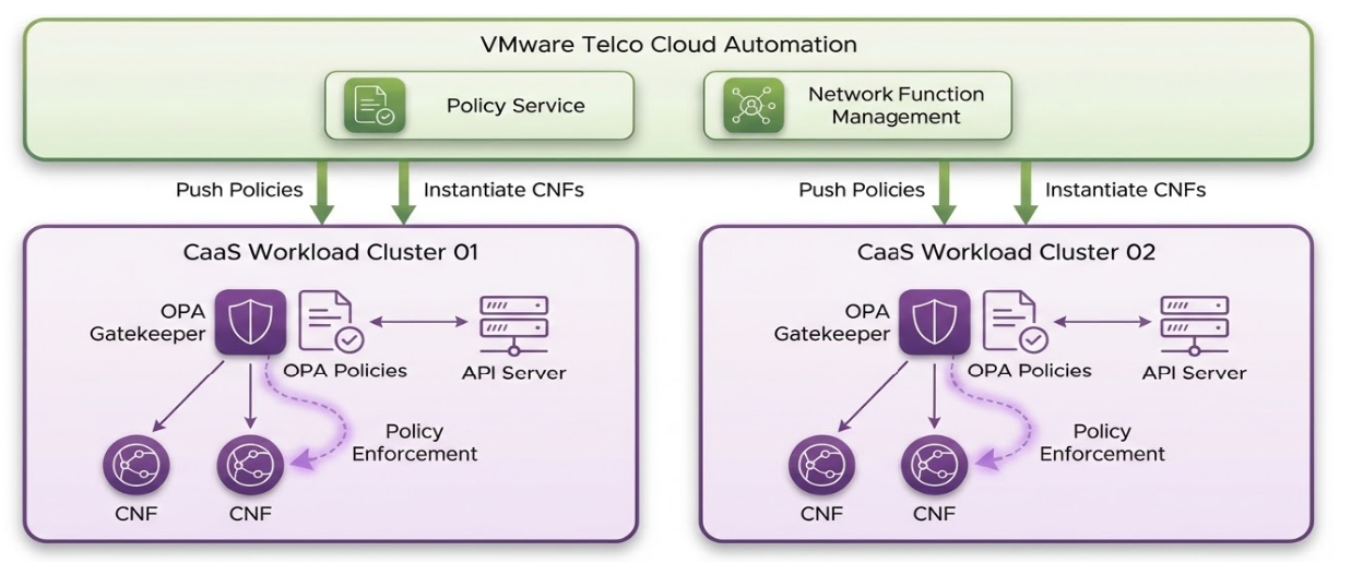 VMware Telco Cloud Platform leverages its Kubernetes Policy Manager to meet this gold standard of security along with the security governance standards and hardening recommendations established by the NSA and CISA. Kubernetes Policy Manager makes use of Open Policy Agent (OPA) and Gatekeeper to provide a standardized framework for policy-driven orchestration and governance.