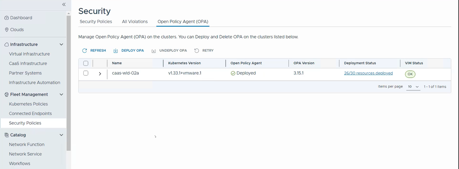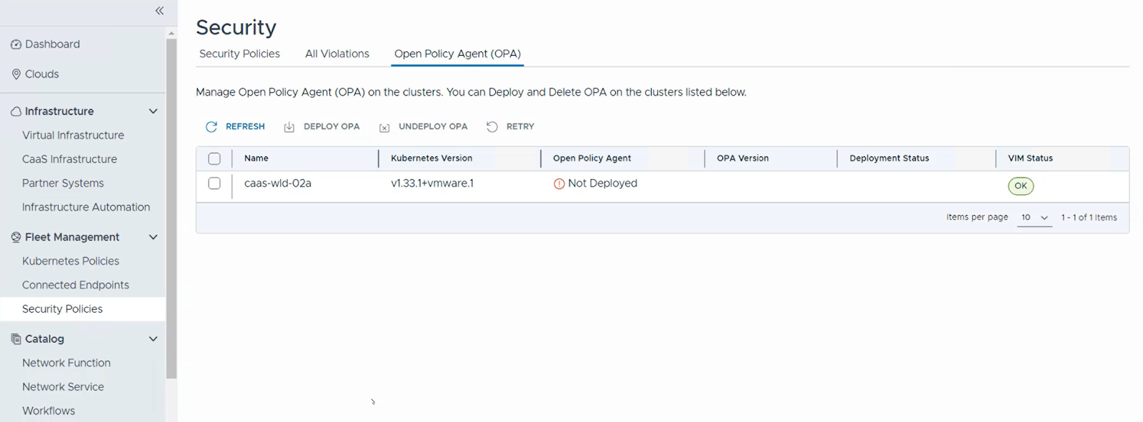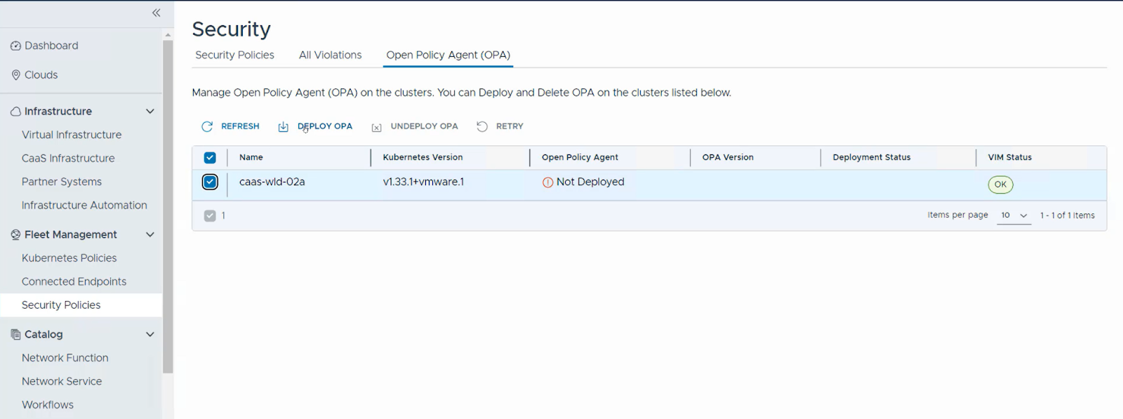 - Select the CaaS workload cluster (e.g., caas-wld-02) and click Deploy OPA. Click Deploy OPA again to confirm.