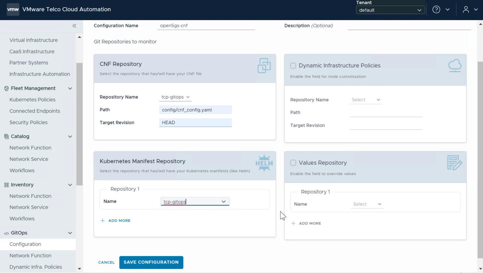 - Then click Configure Gitops. Provide a name for the CNF. Select its relevant repository details, select the manifest and values repositories, and click Save Configuration. And then click Save.