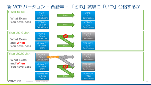 – どの VCP バージョンを取得するかは、「どの」試験に合格したかだけでなく、「いつ」試験に合格したも影響します