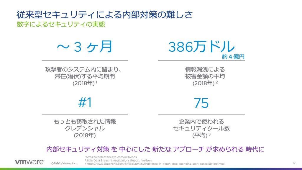 このように内部の繋がりに対するのセキュリティ対策の難しさが逆手にとられ、昨今の脅威では 攻撃者は約 3ヶ月間 システム内部を潜伏することができ、クレデンシャルを入手する活動の成功率をあげてしまう結果を導いしてしまっていることが複数のセキュリティ調査機関から報告されています。