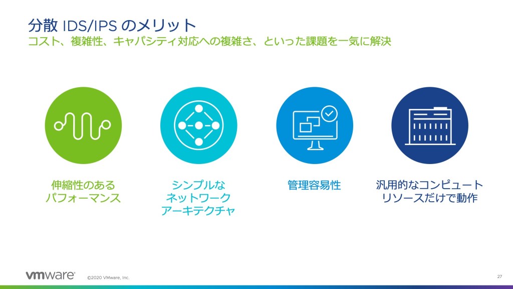 多くの企業が更なるビジネス上のメリットやスピードを促進するため、大量のアプリケーションを運用し、企業システムは一元管理されたデータセンターから分散化され、ネットワークとセキュリティが複雑化しています。これらに対応するため、VMware ではアプリケーション指向のソフトウェア定義型セキュリティをインフラに内在させる新たなアプローチを進めており、その最新セキュリティソリューションの1つである VMware NSX Data Center 分散IDS/IPS を解説したいと思います。