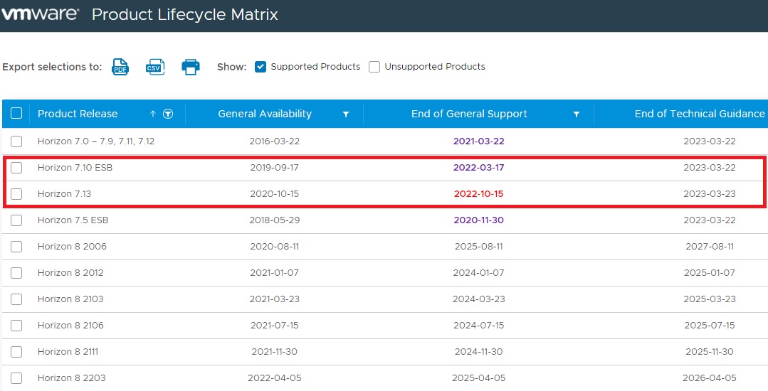 なお、Horizon 7.13 に関しては、2022/10/15 に General Support が終了予定となっておりますのでご留意ください。