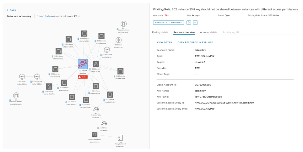 CloudHealth Secure State は、セキュリティチームとプラットフォームチームが、接続されたクラウドオブジェクト全体において小さな設定変更がどういったリスクを高める可能性があるかを理解するのを支援します。