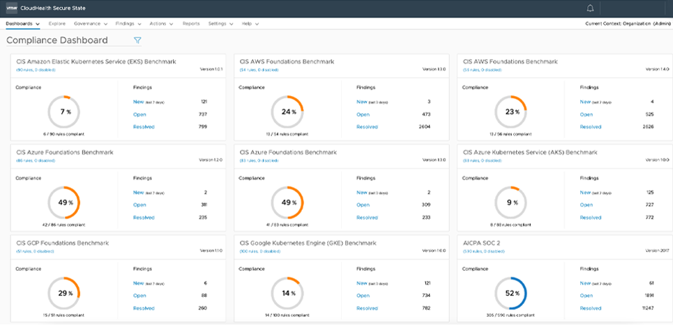 - CIS 、GDPR 、HIPAA 、ISO 27001 、MITRE ATT&CK Cloud 、NIST 、PCI 、SOC 2 などのベンチマークに対する評価と修復の自動化