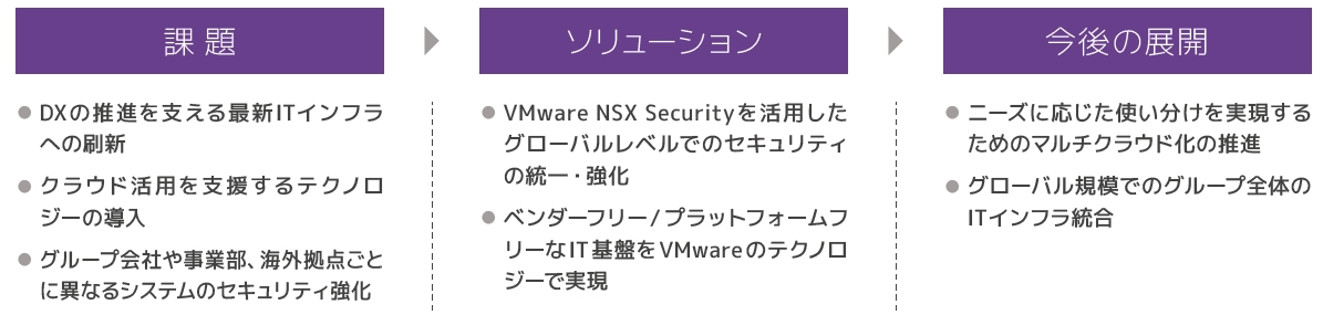 グループ各社で構築運用していたため、業務負荷が大きくなっていたシステム基盤を刷新するため、NSXなどのVMwareソリューションを採用しグループ共通のプライベートクラウド基盤を構築して生産性を向上