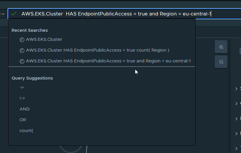 たとえば、最初はすべての EKS クラスタをグラフで表示しました。しかしパブリックアクセスがあるクラスタだけに検索を絞り込み、さらに AWS リージョンごとにそれらのクラスタの数を知りたいとします。