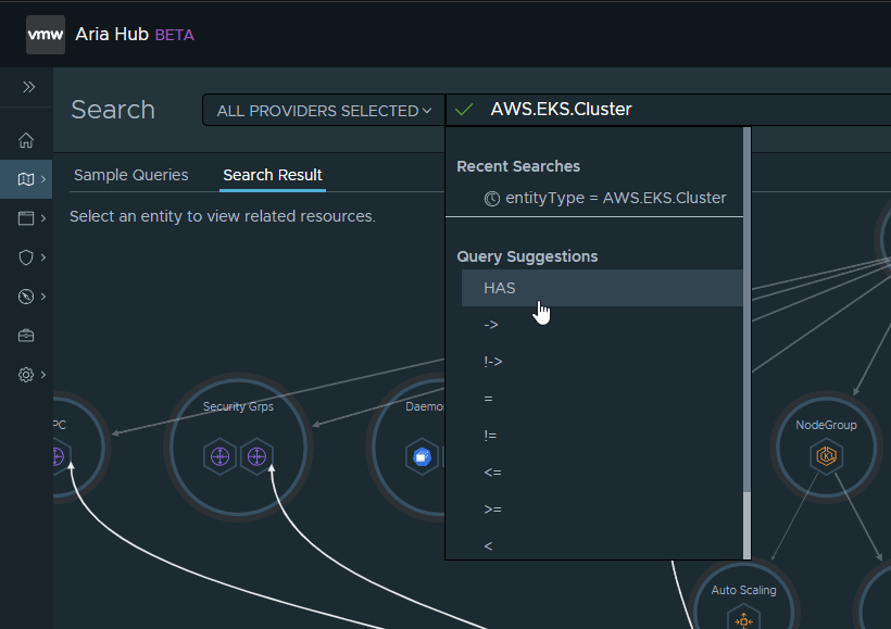 エンティティリンクをクリックすると、選択したすべてのエンティティタイプを表示する事前構築されたクエリを持つ検索ビューに移動します。この場合は EKS クラスタを表示しています。