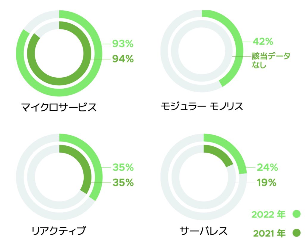 2022 年の調査では、アーキテクチャスタイルに関する回答項目として「モジュラーモノリス」を追加しました。これは、ビジネス要件の変化に対応するためにモノリシックなアプリケーションを効率的に進化させ ることを目的として、モノリシックかつモジュラーなシステムというコンセプトが再び注目を集めるようになってきたためです。