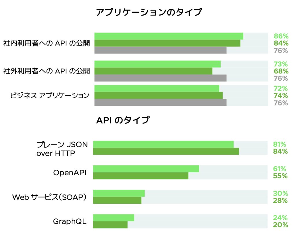 今年の調査においても、API の利用が Spring のもっとも主要なユース ケースとなっています。「社内利用者への API の公開」はこの調査の開始時から年々着実な増加を見せており、今年もトップのユースケース (回答者の 86% が選択)となりました。また、「社外利用者への API の公開」 は今年 2 位に浮上(回答者の 73% が選択)しています。
