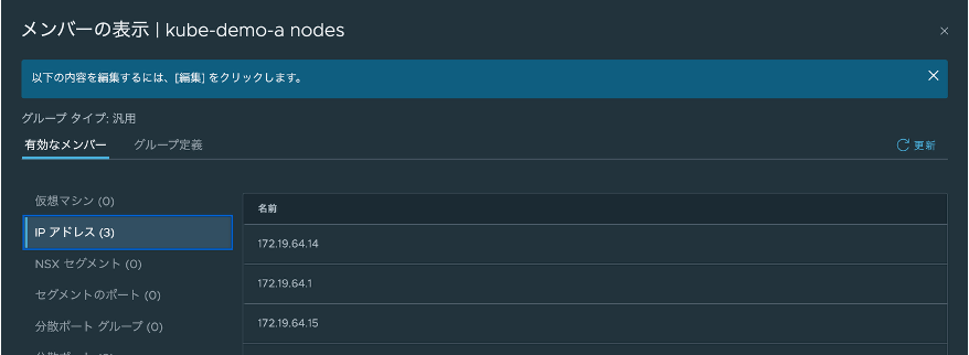 グループ作成後にメンバーを表示すると、”kube-demo-a” クラスタ内のノードと IP がメンバーとして自動的に選択されていることが分かります。