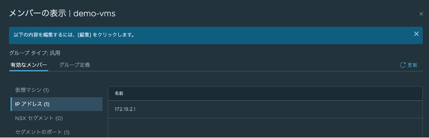 グループ作成後にメンバーを表示すると、”kube-demo-a” クラスタ内の Egress “fruits-app-egress” とその IP がメンバーとして選択されていることが分かります。