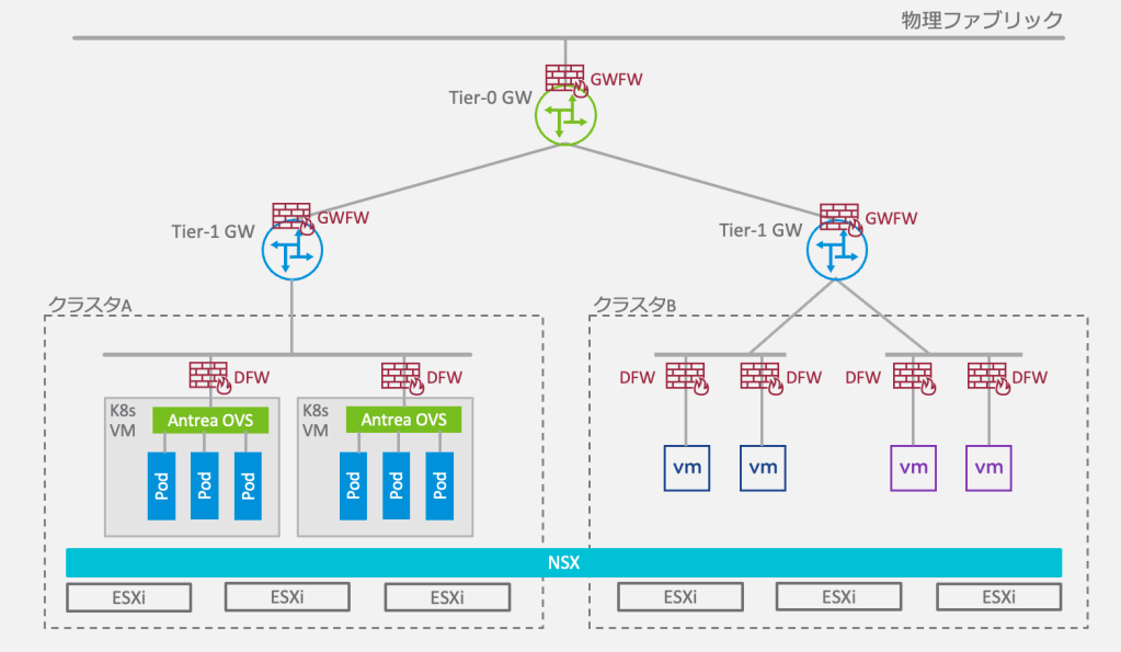 以下の図では異なる vSphere クラスタにある Kubernetes クラスタや VM を NSX 論理ネットワークに接続し、VMware ソフトウェアだけを用いてコンテナと VM ワークロードに対してファイアウォールを適用しているイメージです。この例ではコンテナ〜VM 間で NSX ルーティング (Tier0/Tier1-GW) を使用していますが、VLAN ネットワーク構成で DFW だけを利用することも可能です。