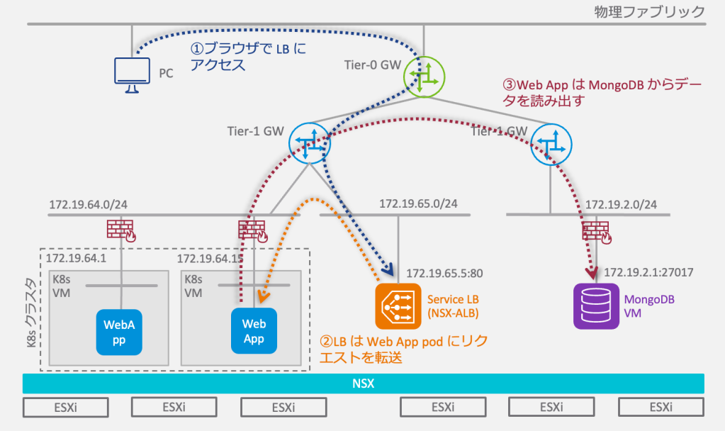 それでは、実際にいくつかのパターンで構成を組んで動作を見ていきましょう。今回は以下のような構成でテスト用のアプリケーションを構成しています。このアプリはフロントエンドの Web App コンテナとバックエンドのデータベース VM から成るシンプルなウェブアプリです。外部ロードバランサーとして NSX-ALB を使用しています。
