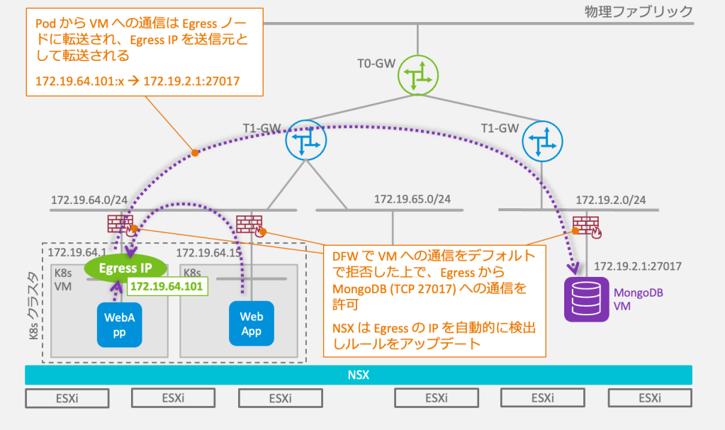 Antrea Egress とはクラスタ外部と通信する特定のコンテナ群に専用の Egress IP アドレスを指定し、通信制御を容易にするための機能です。シナリオ 1 ではクラスタ内のノードを対象に許可したので、すべてのコンテナからデータベース VM へのアクセスが許可されていましたが、Egress を利用すると指定したアプリからのアクセスのみを許可することが容易にできるようになります。