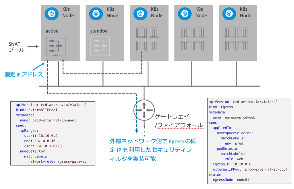 Egress は Antrea のカスタムリソースとして実装されており、下の図のように、特定の Pod のグループに対して出力方向の IP アドレスを固定的に割り当てます。これにより、Kubernetes クラスタ外部のネットワークコンポーネントが特定のコンテナアプリからのトラフィックを一意に識別できるようになります。割り当てる IP アドレスは、ExternalIPPool カスタムリソースを使用してレンジ指定して動的に割り当てる、もしくはレンジ内から指定して割り当てることが可能です。また Egress を実行するノードを指定することも可能です。Egress についてはこちらの記事もご参照いただければと思います。