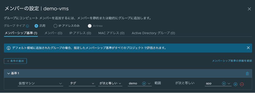 同様にデータベース VM のグループ “demo-vms” を作成します。ここでは NSX タグを利用して VM を識別するように設定しており、”app=demo” の場合に自動的にこのグループメンバーとして認識します。
