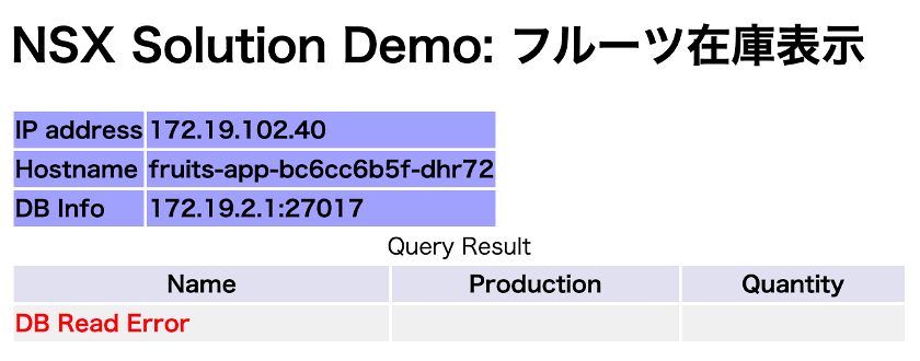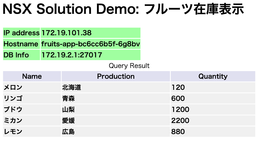 ロードバランサーを介して Web App コンテナに HTTP リクエストを送ると(①、②)、データストアからデータ(フルーツの在庫情報)を読み出して(③)、以下のように表示します。その際に Web App コンテナの IP アドレス、ホスト名、データベース情報(アドレスとポート番号)を同時に表示します。