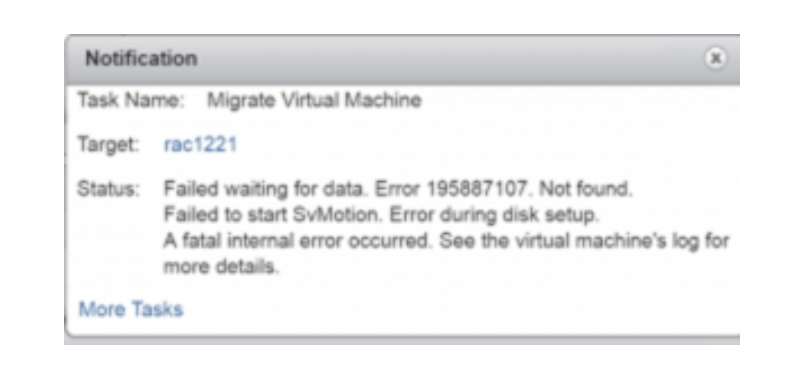 先に記載したように Multi-Writer オプションを使用した vmdk の Storage vMotion はサポートされていないため Oracle RAC を構成する仮想マシンの Storage vMotion を試みるとエラーが表示され実行できません。
