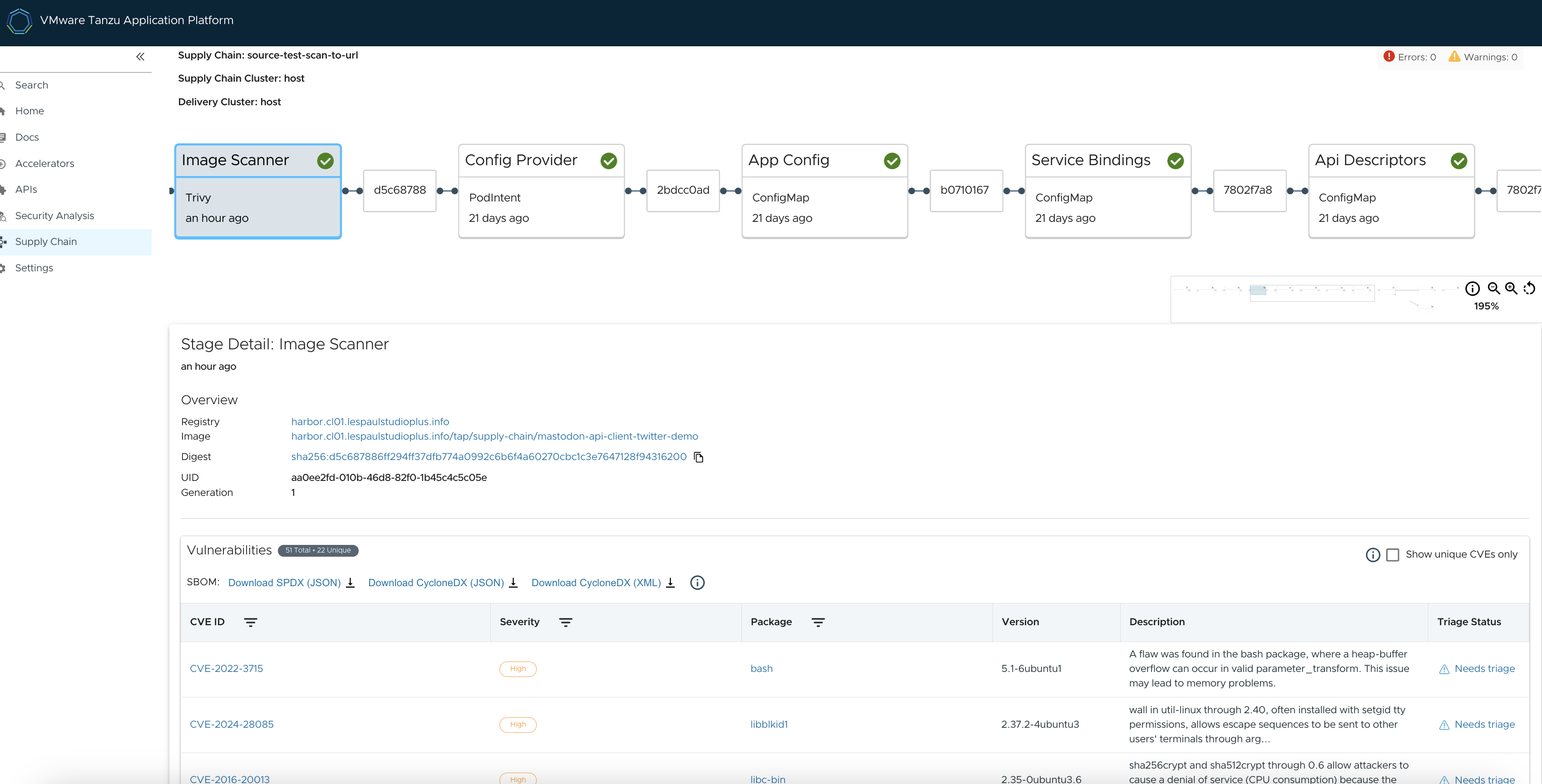 TAP がリリースされた当初ではこの記事でも紹介しているようにスキャン機能には、Achore Grype が採用されていました。当時はまだ Software Bills of Materials (SBOM) *の考えが浸透していない中で、いち早く SBoM をベースとしたスキャン機能を実現するために採用がされました。時は経ち、多くの脆弱性スキャナーがこの SBoM の機能を搭載していくことになります。Scan 2.0 では採用するスキャナーの見直しが図られ、Trivy がベースとして採用されました。(なお、Anchore Grype も引き続き使用は可能ですが、今後は Trivy の利用が推奨されています。)