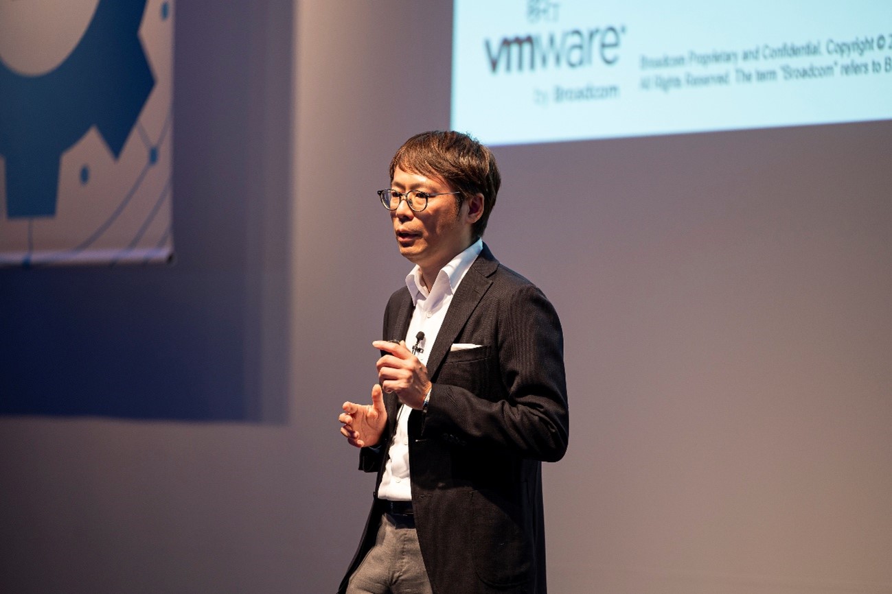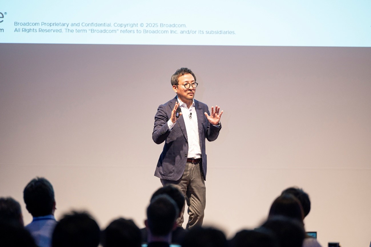 まずは、カントリーマネージャーの山内が登壇し、ブロードコムによるVMware買収から約1年半を経て初めてのメジャーリリースとなったVCF 9の話題とともに、ブロードコムという企業の事業概要について紹介。