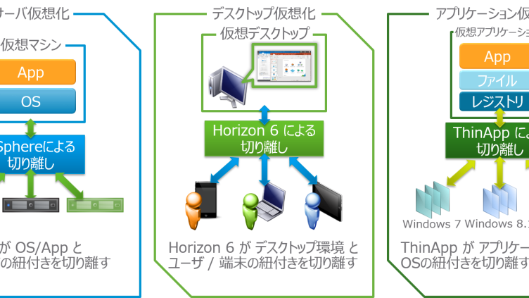 こんにちは。VMware SE の椨木です。 『新卒2年目 SE 社員が贈る 仮想デスクトップのキソ!』シリーズ、スピンオフ版の第1段は、VMware Horizon 6 (以下、Horizon 6)のどのエディションにもバンドルされている「アプリケーションの仮想化」を実現する製品、VMware ThinApp (以下、ThinApp)についてです。この記事を通して、 どういう時に「アプリケーションの仮想化」を行うと嬉しいの? そもそも「アプリケーションの仮想化」ってなに? という部分を一緒に理解していきましょう・・・! §1. 「アプリケーションの仮想化」ってなに? ThinApp が実現できる事としてよく使われる言葉が、「アプリケーションの仮想化」です。このブログのシリーズでは「デスクトップの仮想化」を主に取り扱ってきたわけですが、これは仮想基盤上でデスクトップを仮想化する事によって「物理端末やユーザとデスクトップ環境の紐づきの切り離し」を実現した製品であると言えます。 ThinApp はこの「仮想化」の概念をアプリケーションに取り入れ、アプリケーションを OS にインストールする際にインストールの前後の変化(差分)をキャプチャする事によって、「アプリケーションの実体ファイル」および「アプリケーションの起動時に必要となるファイル」、「アプリケーションの動作に必要となるレジストリ値」を把握し、ひとつの EXE...