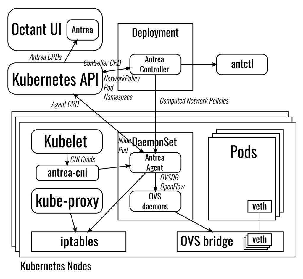 - 藉由Antrea Controller的設計,能夠實作出較傳統Network Policy遠為複雜的安全政策機制,同時也能夠很簡單地提供外部系統(如後面我們要討論的NSX,或整合另一個著名的開源維運工具OCTANT)來進行政策配置與資訊查找。